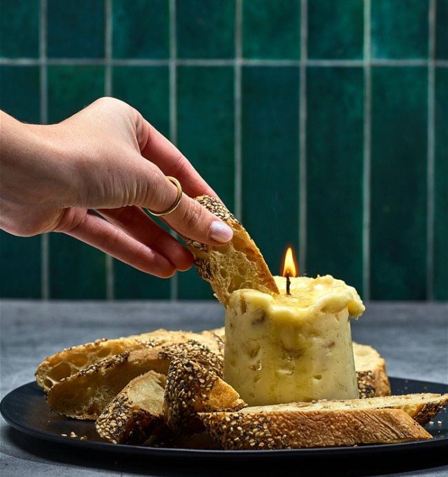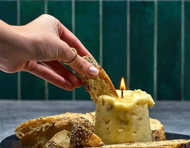 A table-side flight of edible dairy-free BUTTR candles in both sweet and savoury profiles. Lit briefly, then poured or spread, each candle adds warmth, aroma, and theatre—transforming butter into a multisensory experience.